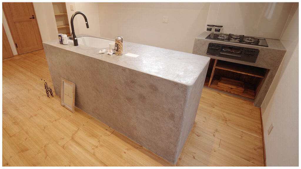 コンクリート調のかっこいいキッチンが出来上がりました。